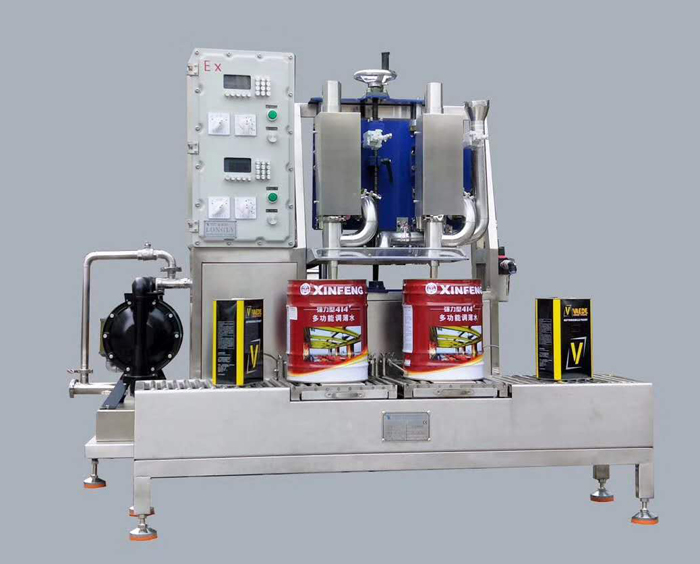 2. Suitable for filling open round barrels within 60kg, both double-head filling and single-head operation are possible. The system adopts programmable PLC control, full English guidance, easy operation; manual barrel loading, automatic filling., equipped with automatic clamping lid.